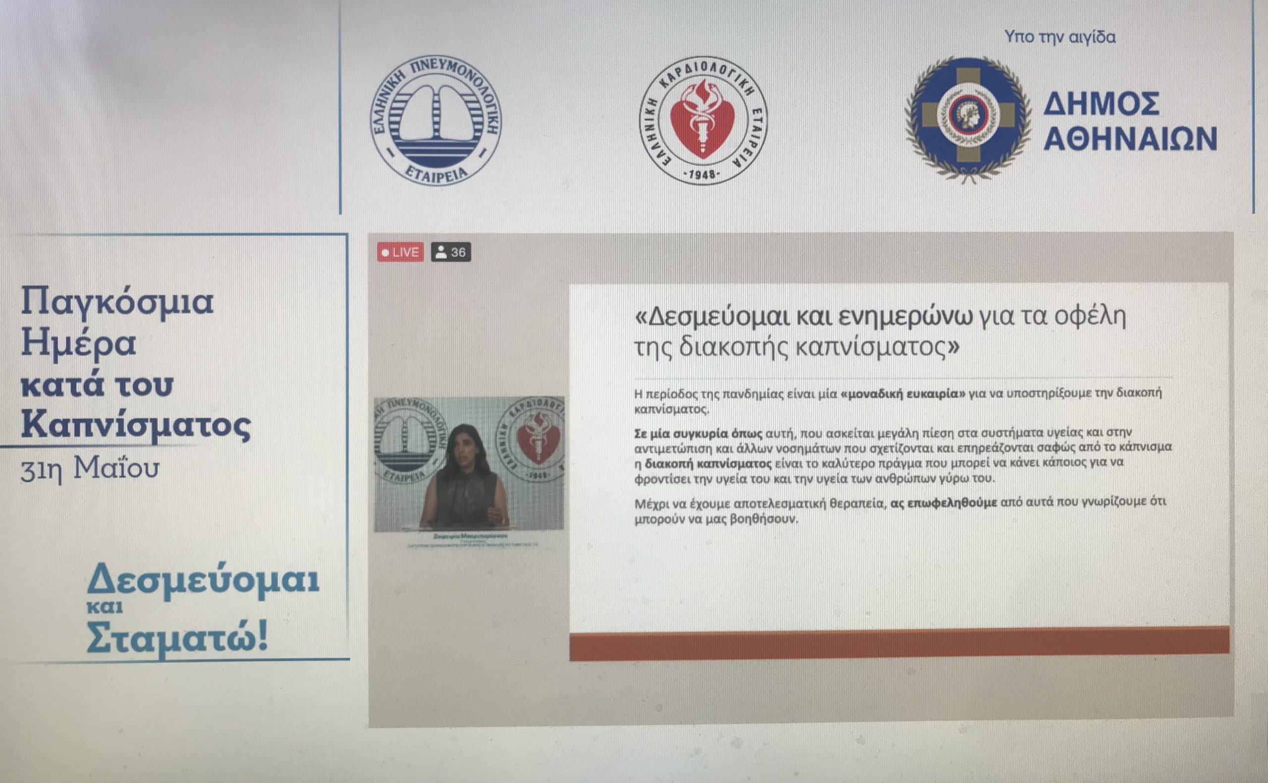 Πρωτοβουλίες ενημέρωσης, με αφορμή την Παγκόσμια Ημέρα κατά του Καπνίσματος (31η Μαΐου), που έχει κεντρικό μήνυμα αυτή τη χρονιά «Δεσμεύομαι και Σταματώ», υλοποιούν από κοινού και υπό την αιγίδα του Δήμου Αθηναίων, η Ελληνική Πνευμονολογική Εταιρεία (Ε.Π.Ε) και η Ελληνική Καρδιολογική Εταιρεία (Ε.Κ.Ε.).