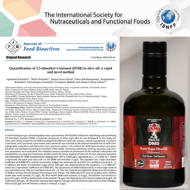 Τον Ιούνιο του 2025, μια διεθνής σύμπραξη επιστημόνων με επικεφαλής τον ομότιμο καθηγητή του Διεθνούς Πανεπιστημίου Ελλάδας και επίτιμο μέλος της Αμερικάνικης Ένωσης Χημικών Λαδιών (AOCS Fellow – USA) κ. Απόστολο Κυριτσάκη, δημοσίευσε στο διεθνές επιστημονικό περιοδικό Journal of Food Bioactives τα εντυπωσιακά αποτελέσματα της πρωτοποριακής μελέτης, υπό τον γενικό τίτλο «Quantification of 3,3-dimethyl-1-butanol (DMB) in olive oil: a rapid and novel method» https://www.bioarmonia.gr/el/studies/dmb (Ελληνική απόδοση: Ποσοτικοποίηση της 3,3-διμέθυλο-1-βουτανόλης (DMB) στο ελαιόλαδο: Μια ταχεία και καινοτόμα μέθοδος).