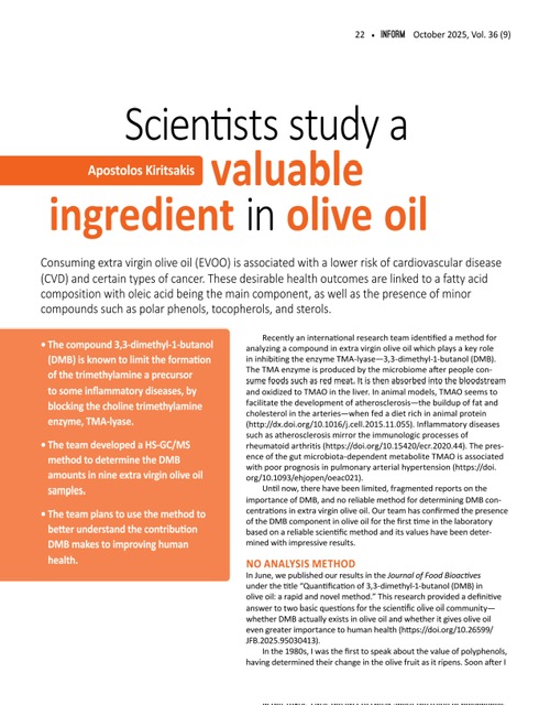 Με βάση την ανωτέρω δημοσίευση, το γνωστό περιοδικό INFORM της Αμερικανικής Ένωσης Χημικών Λαδιών (AOCS), στο τεύχος Οκτωβρίου του 2025 σε ειδικό άρθρο του με τίτλο “Scientists study a valuable ingredient in olive oil” (Επιστήμονες μελετούν ένα πολύτιμο συστατικό στο ελαιόλαδο), όπου γίνεται ιδιαίτερη και ευρεία αναφορά στην ένωση DMB και στον ρόλο της στην ανθρώπινη υγεία.