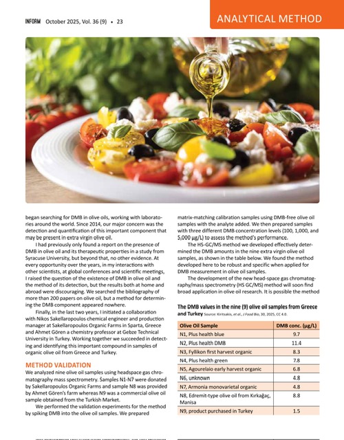 Έως τώρα δεν είχε δημοσιευθεί καμία μέθοδος που να προσδιορίζει εργαστηριακά και με ασφάλεια τις συγκεντρώσεις της ουσίας αυτής στο εξαιρετικό παρθένο ελαιόλαδο. Όπως σημειώνουν οι ερευνητές, είναι η πρώτη φορά που επιβεβαιώνεται εργαστηριακά, βάσει μιας αξιόπιστης επιστημονικής μεθόδου, η παρουσία του συστατικού DMB στο ελαιόλαδο και προσδιορίζονται οι τιμές της με εντυπωσιακά αποτελέσματα.