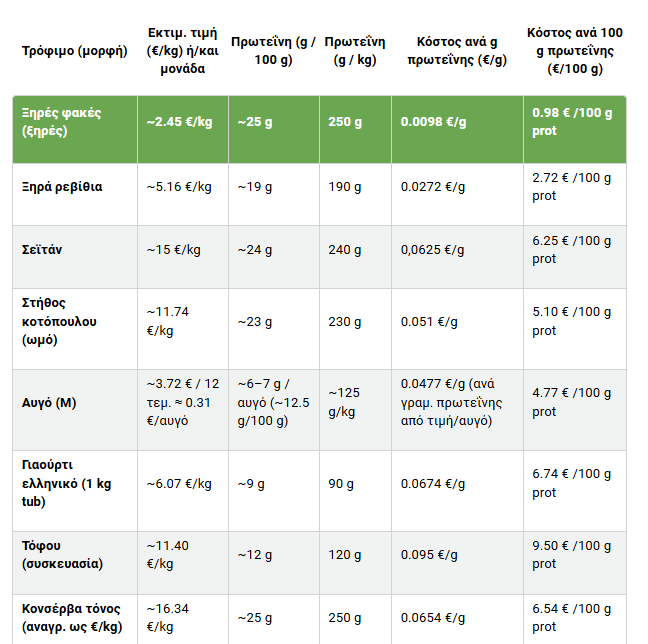 Πίνακας — Εκτιμώμενου κόστους & κόστος ανά γραμμάριο Πρωτεΐνης (Ελλάδα, 2025 — ενδεικτικό)