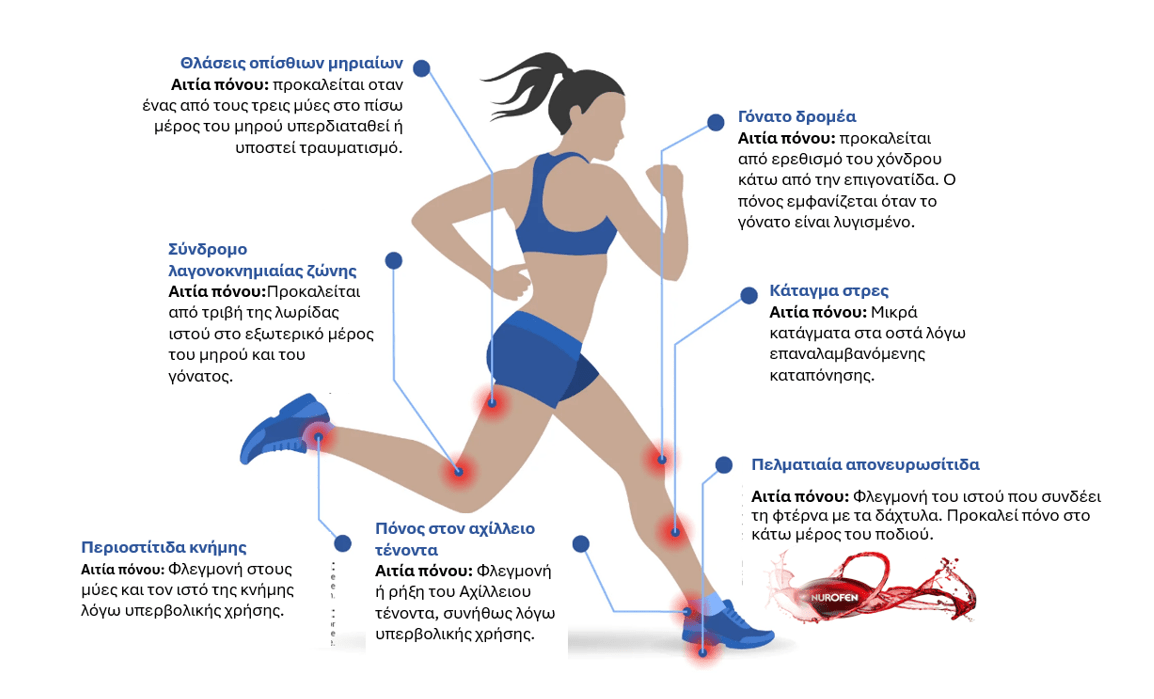 Οι δρομείς παρουσιάζουν συχνά θλάσεις, τενοντοπάθειες και σύνδρομα υπέρχρησης, όπως το σύνδρομο λαγονοκνημιαίας ταινίας. Οι καταστάσεις αυτές οφείλονται σε επαναλαμβανόμενη μηχανική φόρτιση και μυϊκή κόπωση, ενώ η φλεγμονώδης αντίδραση που ακολουθεί οδηγεί σε συσσώρευση προσταγλανδινών (PGE₂), με αποτέλεσμα τον πόνο και το οίδημα.