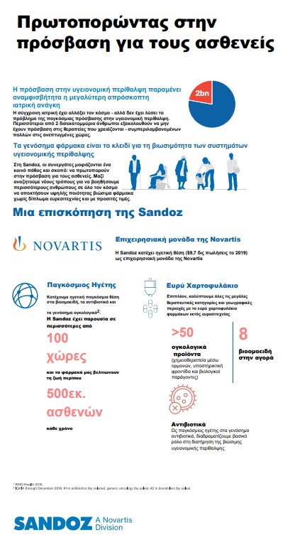 Η Novartis παρουσιάζει και μία επισκόπηση της Sandoz τονίζοντας ότι «με τα μάτια στραμμένα στο μέλλον, συνεχίζουμε να εργαζόμαστε με όραμα και ευθύνη για τον ασθενή, με στόχο την πραγμάτωση της αποστολής μας: να βοηθάμε τους ανθρώπους να ζουν περισσότερο και με καλύτερη ποιότητα ζωής. Μέσω της επιχειρησιακής μας μονάδας Sandoz, παρέχουμε σε όλον τον κόσμο πολλαπλές λύσεις πρόσβασης σε υψηλής ποιότητας φάρμακα και υποστηρίζουμε τις αυξανόμενες ανάγκες της κοινωνίας για ιατροφαρμακευτική περίθαλψη».
