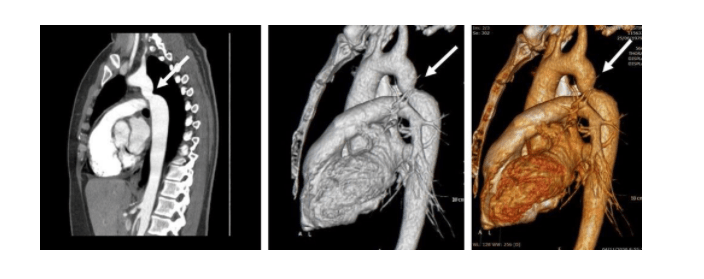 Η ασθενής διερευνήθηκε περαιτέρω με αξονική αγγειογραφία της αορτής για την επιβεβαίωση ή τον αποκλεισμό της διάγνωσης. Η εξέταση έδειξε ελίκωση και ήπια στένωση του αυλού της θωρακικής αορτής περιφερικά της αριστερής υποκλειδίου αρτηρίας (εικόνα – λευκά βέλη) και ήπια μεταστενωτική διάταση της κατιούσας θωρακικής αορτής, ευρήματα συμβατά με ψευδή στένωση του ισθμού της αορτής.