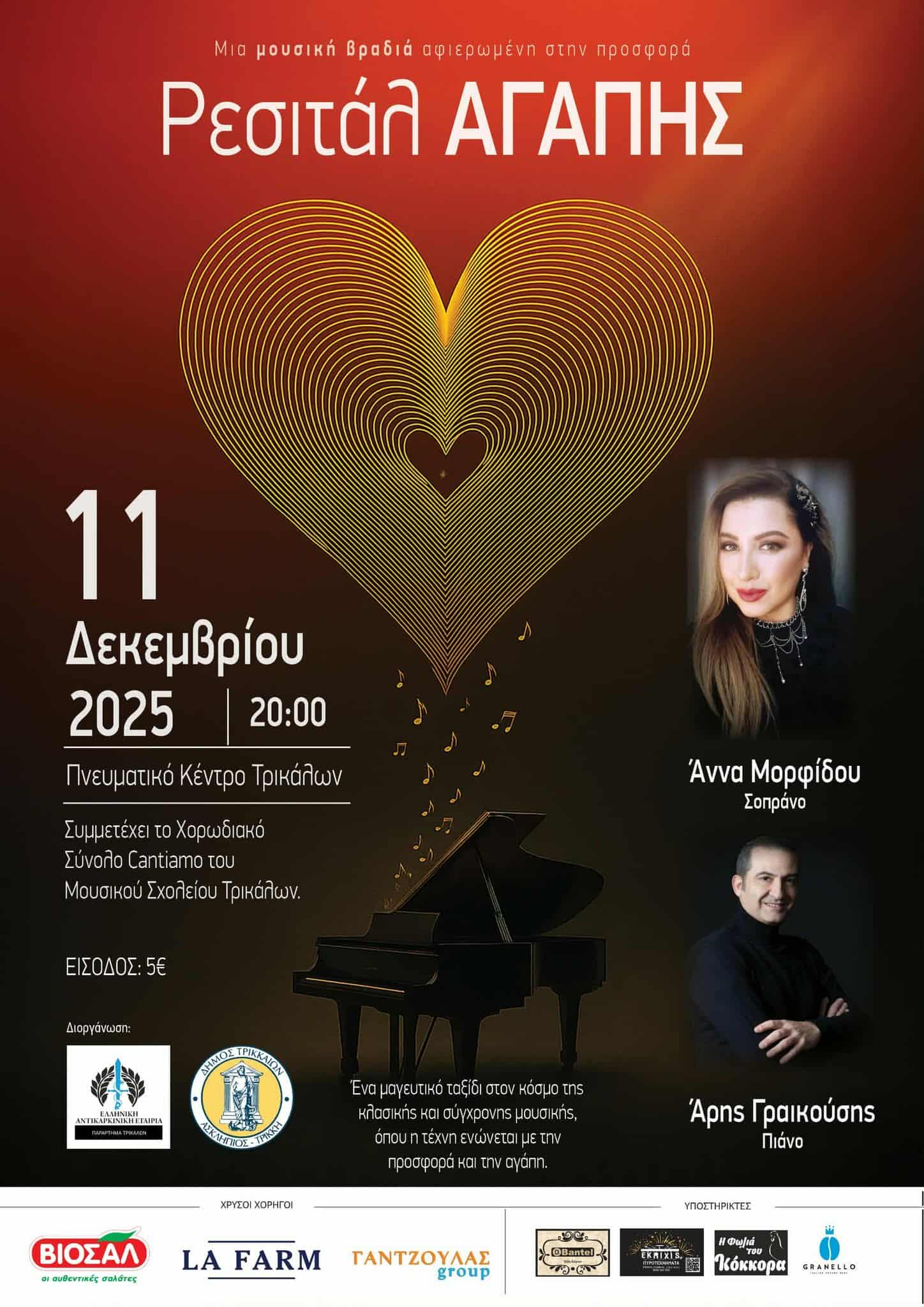 Η Αντικαρκινική Εταιρεία Τρικάλων, υπό την αιγίδα του Δήμου Τρικκαίων, διοργανώνει μια ξεχωριστή φιλανθρωπική βραδιά με τίτλο «Ρεσιτάλ Αγάπης», όπου η μουσική συναντά την ανθρωπιά και η τέχνη ενώνει τις ψυχές. Στο επίκεντρο της εκδήλωσης βρίσκονται δύο διακεκριμένοι καλλιτέχνες: Η σπουδαία Τρικαλινή σοπράνο Άννα Μορφίδου, της οποίας η φωνή αγγίζει βαθιά την ψυχή με την αισθαντικότητά της, και ο καταξιωμένος πιανίστας Άρης Γραικούσης, που μεταμορφώνει τις νότες σε ζωντανά συναισθήματα.
