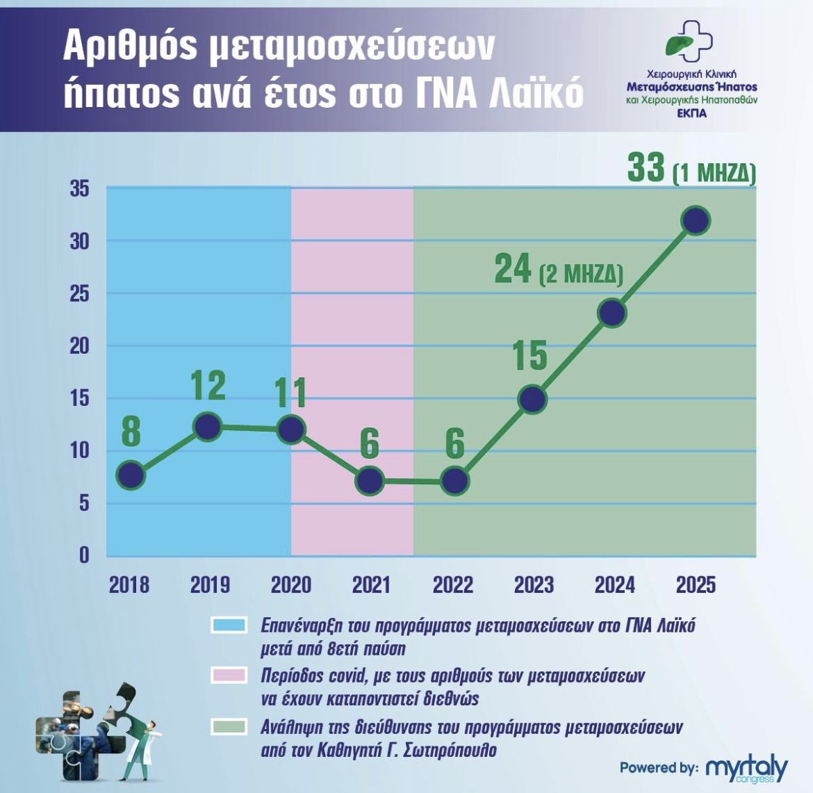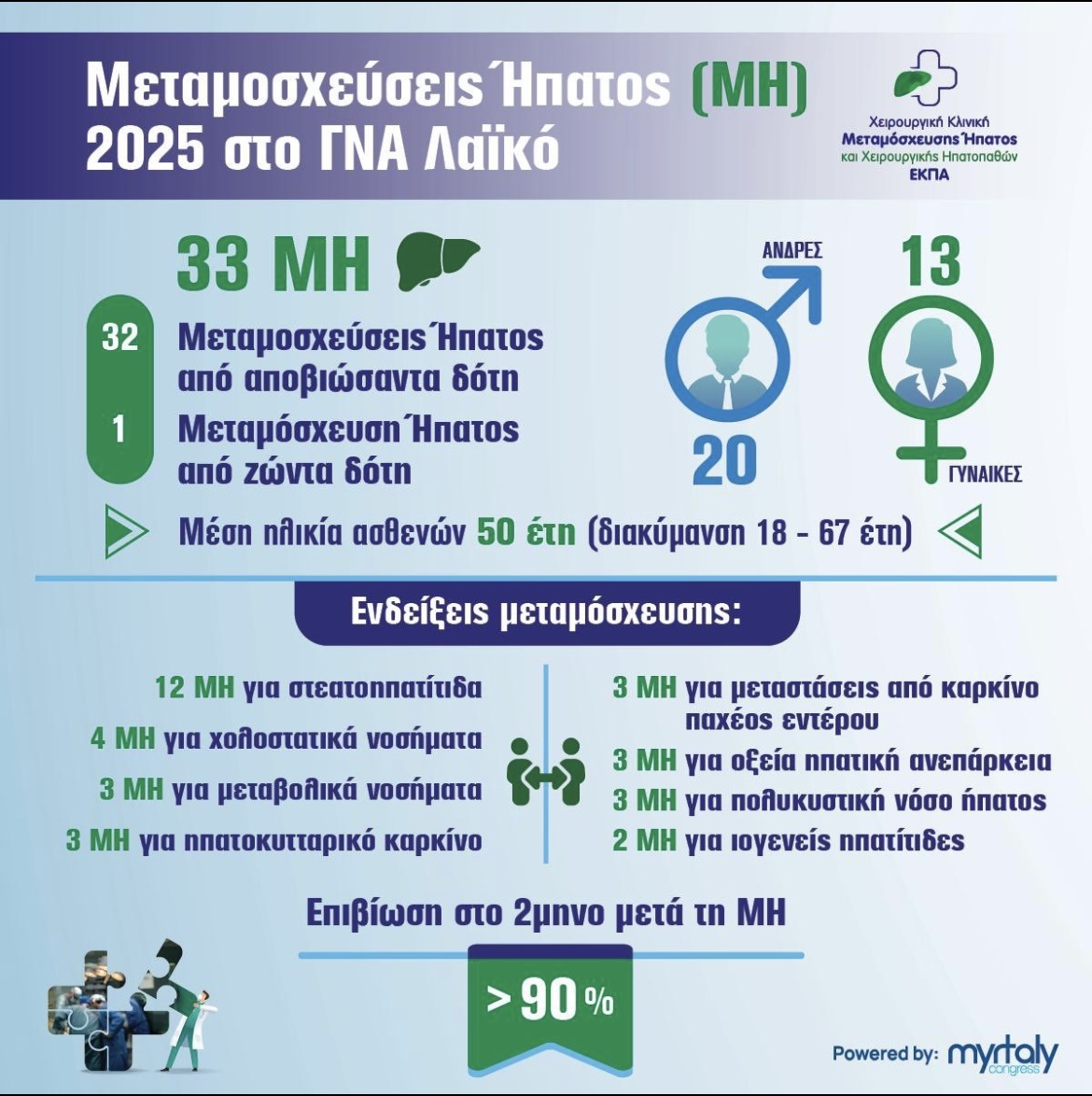 Σύμφωνα με τα επίσημα στοιχεία του νοσοκομείου, μέσα στο 2025 πραγματοποιήθηκαν συνολικά 33 μεταμοσχεύσεις ήπατος, εκ των οποίων οι 32 από αποβιώσαντες δότες και μία από ζώντα δότη. Πρόκειται για τη μεγαλύτερη ετήσια επίδοση από το 2018, χρονιά κατά την οποία το πρόγραμμα μεταμοσχεύσεων στο Λαϊκό επανεκκίνησε μετά από οκταετή παύση.
