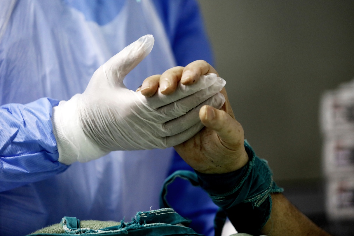 Στη ΜΕΘ του νοσοκομείου Σωτηρία ο εντατικολόγoς Κωστής Ποντίκης αφυπνίζει COVID-19 ασθενή από τεχνητό κώμα. Εκείνος ανταποκρίνεται στο παράγγελμα του γιατρού και του σφίγγει το χέρι. Αθήνα, 17 Απριλίου 2020