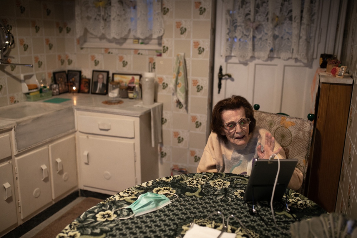 Η κυρία Κωνσταντίνα Βαβουράκη, 85 ετών, συνομιλεί με την εγγονή της μέσω βιντεοκλήσης κατά τη διάρκεια της δεύτερης καραντίνας στην Αθήνα, 5 Δεκεμβρίου 2020