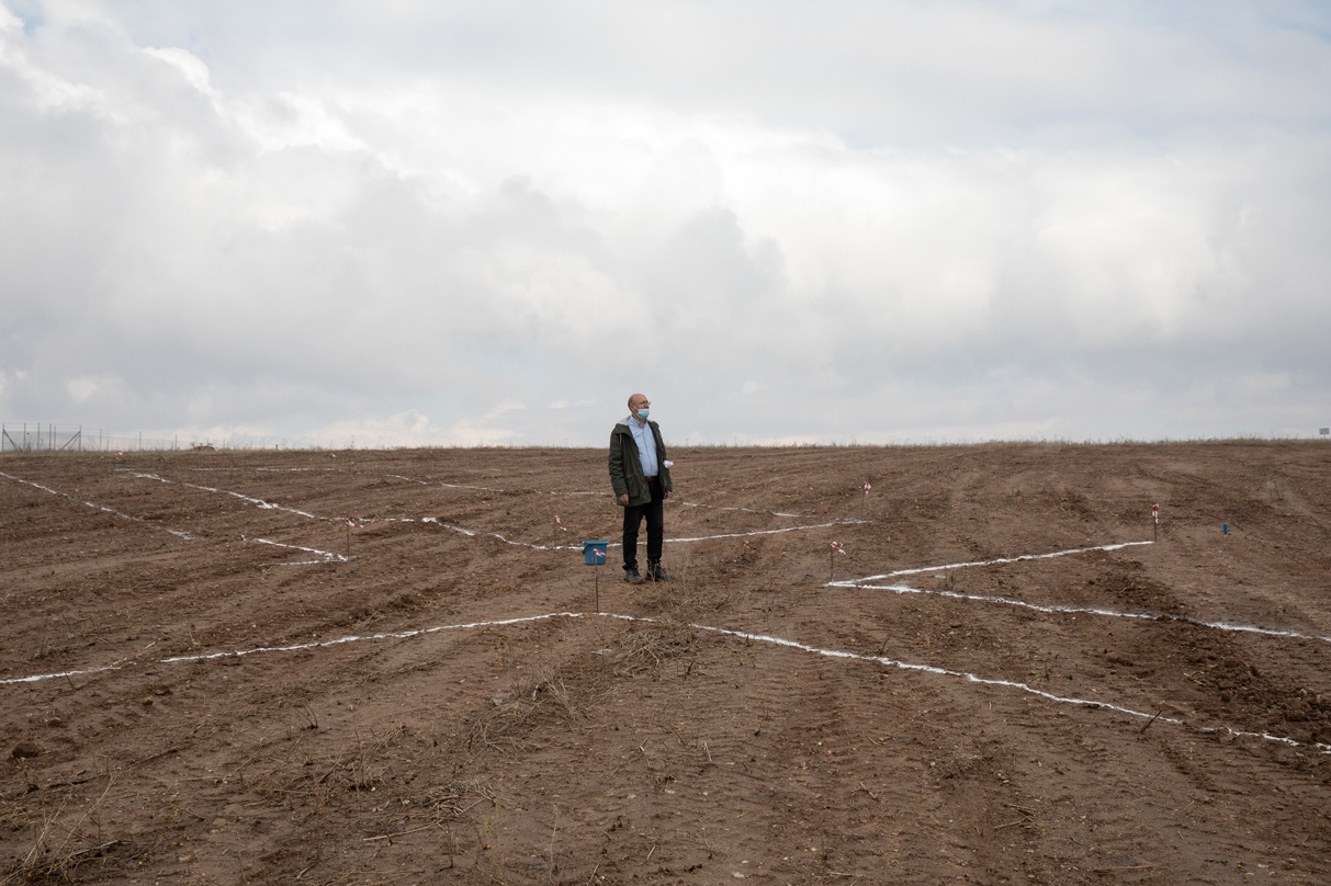 Νεκροταφείο COVID-19. Τοπογράφος μηχανικός στέκεται ανάμεσα στις γραμμές οριοθέτησης για την επέκταση νεκροταφείου στη Θεσσαλονίκη, 5 Δεκεμβρίου 2020
