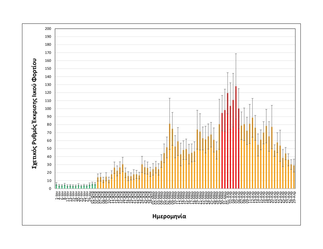 Όπως φαίνεται στα διαγράμματα που παρουσιάζει το ΑΠΕ-ΜΠΕ, μετά την πρώτη εβδομάδα του Απριλίου και μέχρι το τέλος του μήνα έχει σταδιακά επέλθει μία σημαντική αποκλιμάκωση της συγκέντρωσης του ιού στα αστικά απόβλητα.
