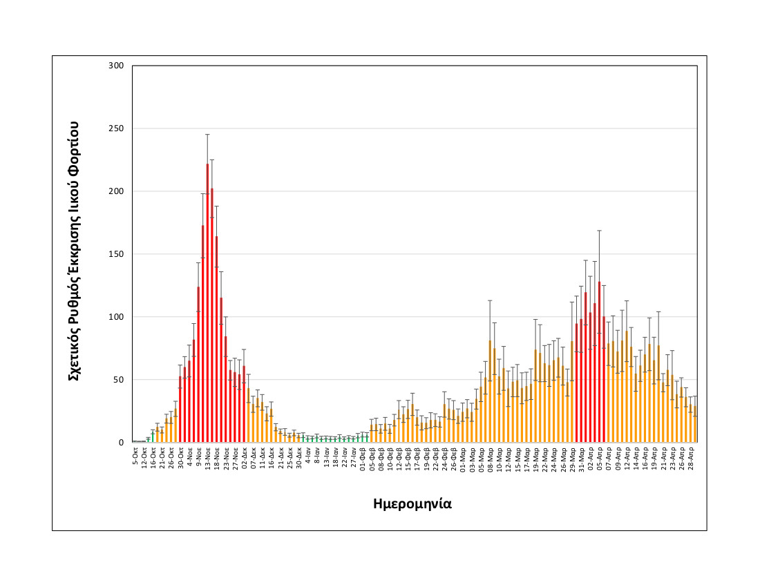 Όπως φαίνεται στα διαγράμματα που παρουσιάζει το ΑΠΕ-ΜΠΕ, μετά την πρώτη εβδομάδα του Απριλίου και μέχρι το τέλος του μήνα έχει σταδιακά επέλθει μία σημαντική αποκλιμάκωση της συγκέντρωσης του ιού στα αστικά απόβλητα.