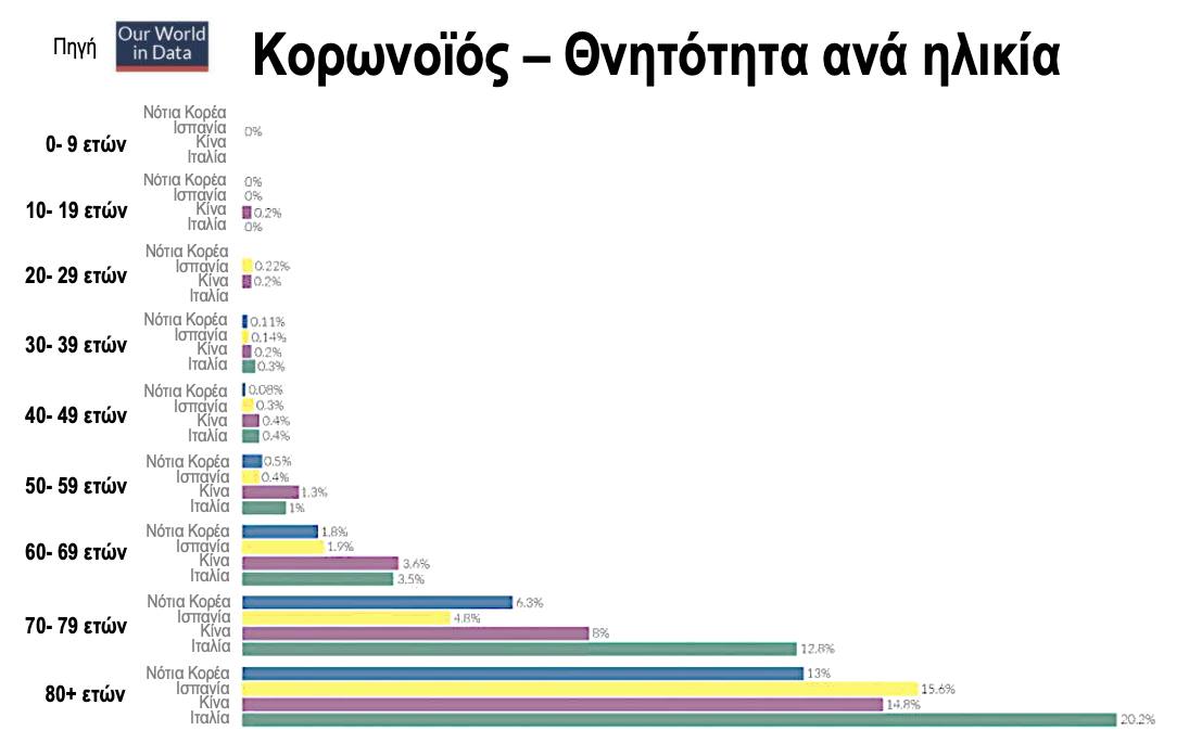 Όπως σημειώνει, η θνητότητα από τον κορονοϊό ανά ηλικιακή ομάδα διαφέρει σημαντικά και είναι πολλαπλάσια στους άνω των 50 ετών σε σύγκριση με τους νεότερους. Για παράδειγμα, είναι υψηλή στους 70 ετών και είναι σημαντική και στους άνω των 60.