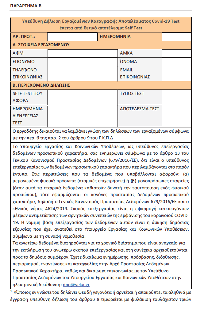 Οι εργαζόμενοι δηλώνουν υποχρεωτικά το αποτέλεσμα του επαναληπτικού ελέγχου στην Πλατφόρμα Δήλωσης Αποτελεσμάτων COVID-19 Tests του Π.Σ. ΕΡΓΑΝΗ με τη συμπλήρωση του ειδικού εντύπου «Υπεύθυνη Δήλωση Εργαζομένων Καταγραφής Αποτελέσματος COVID-19 έπειτα από θετικό αποτέλεσμα Self Test», κατά τα οριζόμενα στην παρ. 3, σύμφωνα με το υπόδειγμα του Παραρτήματος Β που προσαρτάται στην παρούσα και αποτελεί αναπόσπαστο μέρος της.