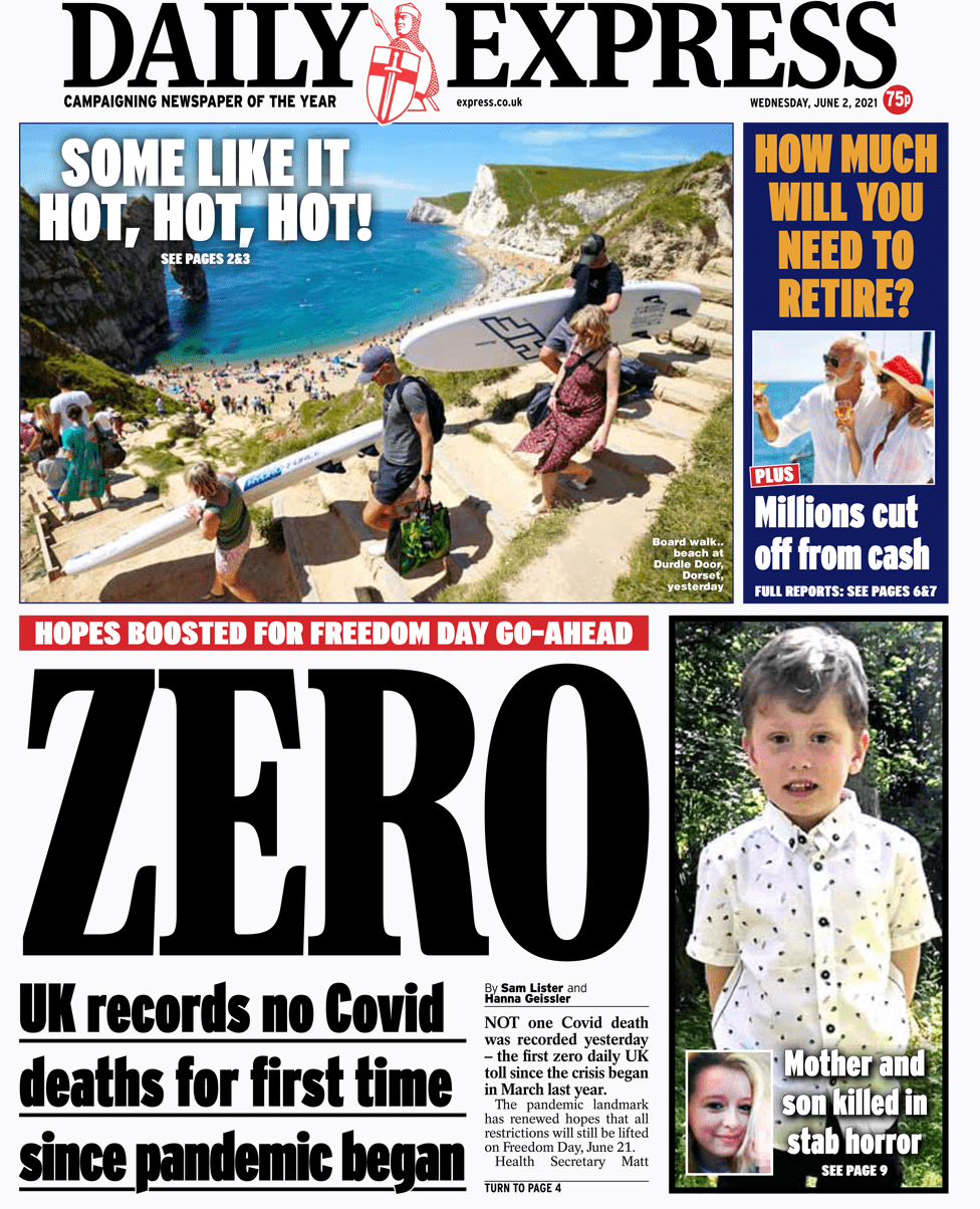 Για πρώτη φορά από τις 11 Μαρτίου, πριν καν επιβληθεί το πρώτο lockdown, το Ηνωμένο Βασίλειο δεν κατέγραψε την Τρίτη 1/6 κανέναν θάνατο από κορονοϊό και οι βρετανικές εφημερίδες πανηγυρίζουν. Χαρακτηριστικό είναι το πρωτοσέλιδο της Daily Express η οποία έχει τον τίτλο «Μηδέν»!