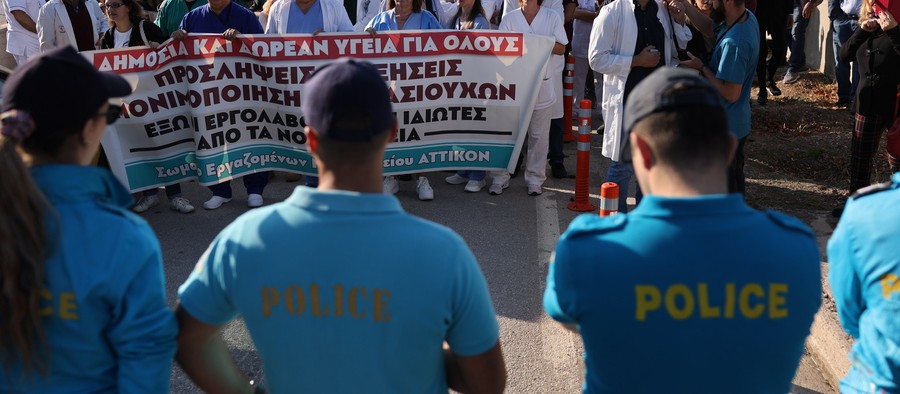 Ισχυρή αστυνομική δύναμη βρίσκεται στο νοσοκομείο Αττικόν για την επίσκεψη του πρωθυπουργού Κυριάκου Μητσοτάκη και του υπουργού Υγείας Άδωνι Γεωργιάδη, καθώς οι εργαζόμενοι πραγματοποίησαν μεγάλη συγκέντρωση διαμαρτυρίας.