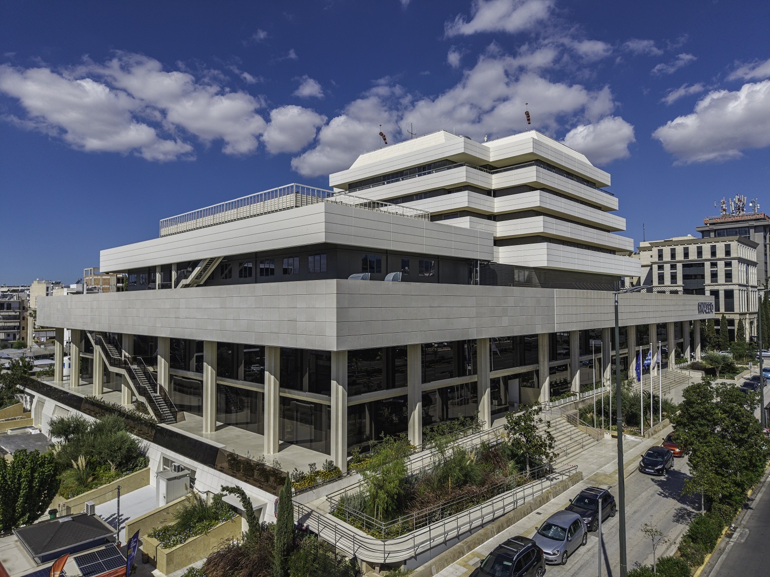 Με χαρακτηριστικό πυραμοειδές σχήμα, επτά ορόφους που αναπτύσσονται γύρω από το κεντρικό αίθριο, γυάλινες επιφάνειες, μάρμαρα Ιωαννίνων και χώρους πράσινου έγινε κτίριο – ορόσημο.