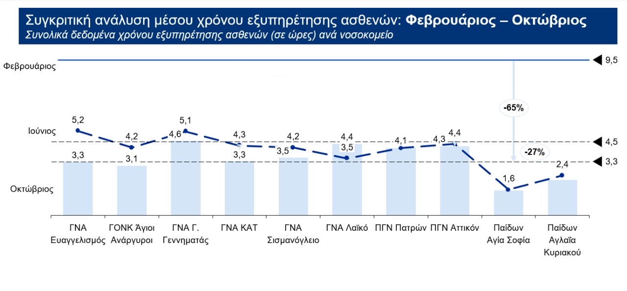 Χάρη στις στοχευμένες παρεμβάσεις και τις οργανωτικές αλλαγές που υλοποιούμε τους τελευταίους μήνες, ο μέσος χρόνος εξυπηρέτησης των ασθενών στα Τμήματα Επειγόντων Περιστατικών μειώθηκε κατά 65% την περίοδο Φεβρουάριος – Οκτώβριος 2025.