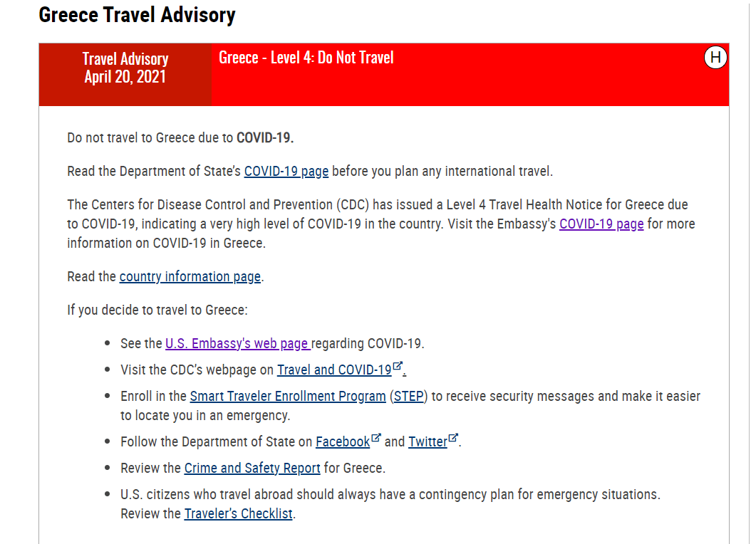«Η πανδημία Covid-19 εξακολουθεί να δημιουργεί για τους ταξιδιώτες κινδύνους άνευ προηγουμένου. Εκδόθηκαν επικαιροποιημένες οδηγίες, με βάση και τις συστάσεις του CDC. Αυτή η επικαιροποίηση έχει σαν αποτέλεσμα τη σύσταση «Μην ταξιδεύετε» στο 80% των χωρών παγκοσμίως», αναφέρει επί λέξει η σχετική ανακοίνωση.
