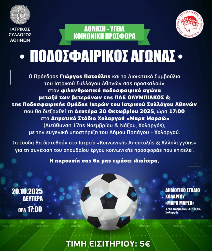 Ο Πρόεδρος Γ. Πατούλης και του Δ.Σ του Ιατρικού Συλλόγου Αθηνών προσκαλούν το κοινό να στηρίξει τον φιλανθρωπικό ποδοσφαιρικό αγώνα που θα γίνει τη Δευτέρα 20 Οκτωβρίου 2025, στις 17:00, στο Δημοτικό Στάδιο Χολαργού «Μαρκ Μαρσώ» (17ης Νοεμβρίου & Νάξου, Χολαργός).