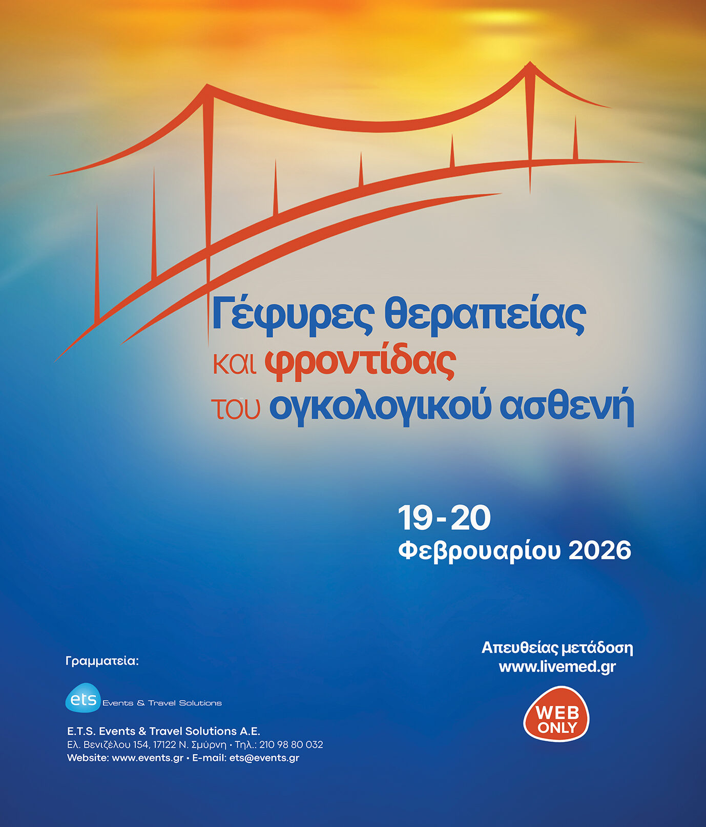 Το 15ο ετήσιο διήμερο διαδικτυακό επιστημονικό συνέδριο της αστικής μη κερδοσκοπικής εταιρίας ΑΚΟΣ, με τίτλο «Γέφυρες θεραπείας και φροντίδας του ογκολογικού ασθενή», θα πραγματοποιηθεί την Πέμπτη 19 και την Παρασκευή 20 Φεβρουαρίου 2026, με τη συμμετοχή διακεκριμένων επιστημόνων από τον χώρο της ογκολογίας. Το συνέδριο αναδεικνύει την ανάγκη ώσμωσης, συνεργασίας και κοινής πορείας των ειδικοτήτων προς όφελος των ασθενών με καρκίνο, σε μια περίοδο όπου η επιστήμη αλλάζει ραγδαία τον τρόπο αντιμετώπισης της νόσου.