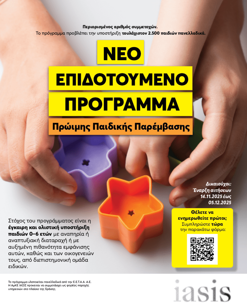 Στο νέο Πρόγραμμα Πρώιμης Παιδικής Παρέμβασης (ΠΠΠ) για παιδιά ηλικίας 0–6 ετών, συμμετέχουν ως Πιστοποιημένοι Πάροχοι, Τα Κέντρα Ημέρας πρώιμης παρέμβασης της ΑμΚΕ ΙΑΣΙΣ σε Αθήνα και Θεσσαλονίκη, “Connect Autism” και “Connect Family”.